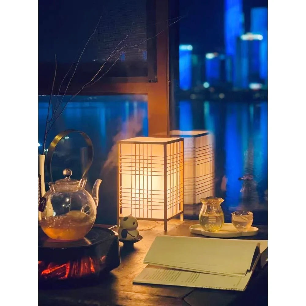 Inspirert av japanske lanterner, kombinerer denne bordlampen naturlig treverk og vertikale linjer for å skape et mykt, avslappende lys. Perfekt for å skape en beroligende atmosfære i en stue, et soverom eller et meditasjonsområde.