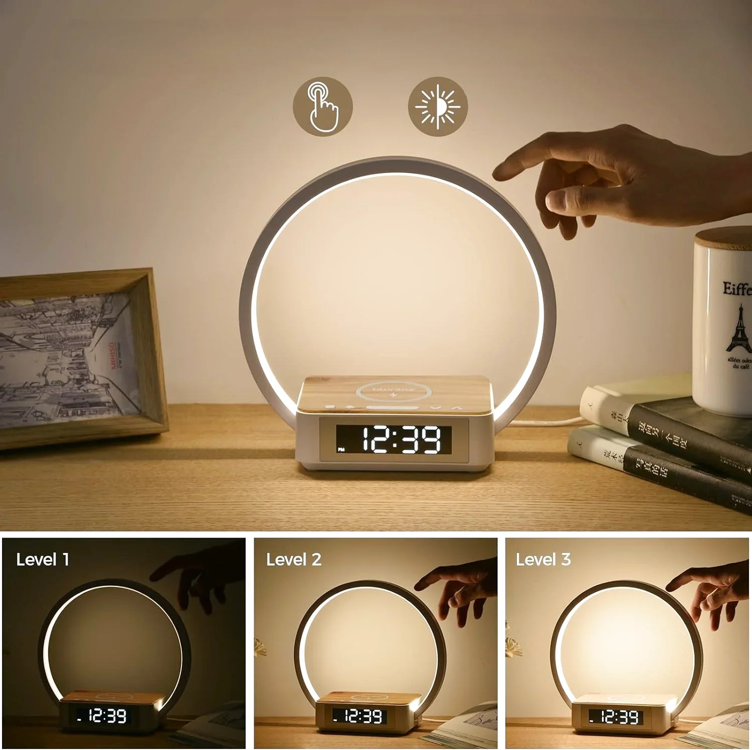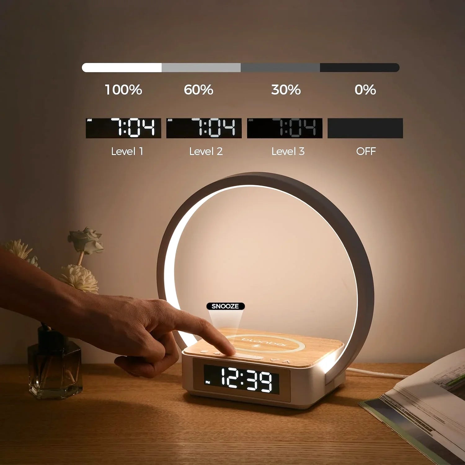 Kombiner minimalistisk eleganse og hverdagslig nytteverdi med denne 3-i-1-nattlampen. Den buede lysdioden gir en myk, justerbar glød, mens LED-klokken minner deg på klokken med et raskt blikk. Bare plasser telefonen på trebasen for å nyte rask og stillegående trådløs lading. La dette moderne møbelet forenkle nattrutinen din og forskjønne soverommet ditt.