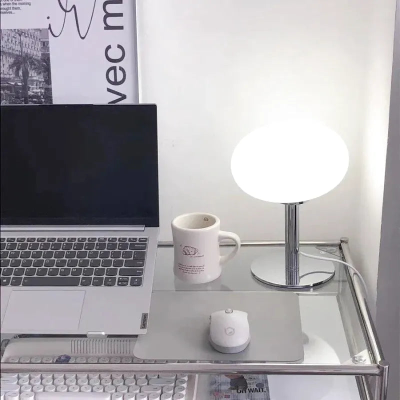 Denne elegante bordlampen gir et elegant preg til hjemmet ditt. Kromfoten og opalglassskjermen sprer et mykt og behagelig lys, ideelt for å skape en koselig atmosfære i stuen, soverommet eller kontoret.
